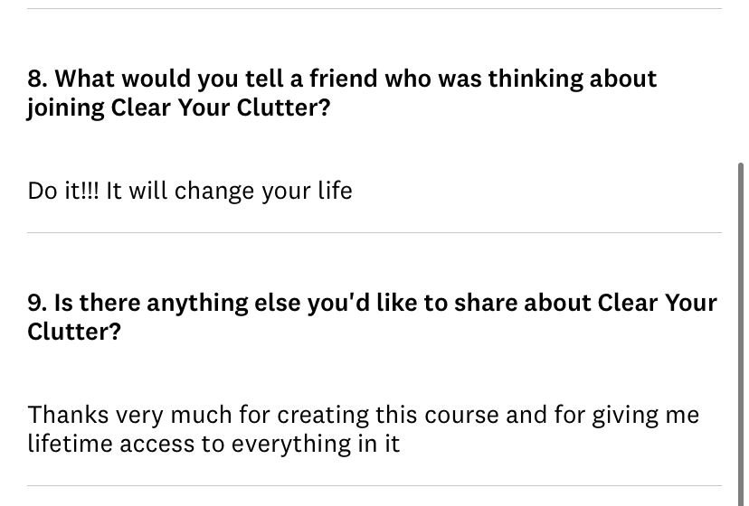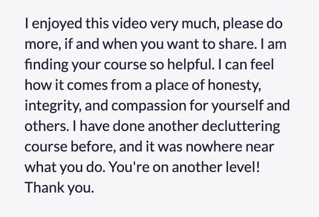 "I am finding your course so helpful. I can feel how it comes from a place of honesty, integrity, and compassion for yourself and others. I have done another decluttering course before, and it was nowhere near what you do. You're on another level! Thank you."
