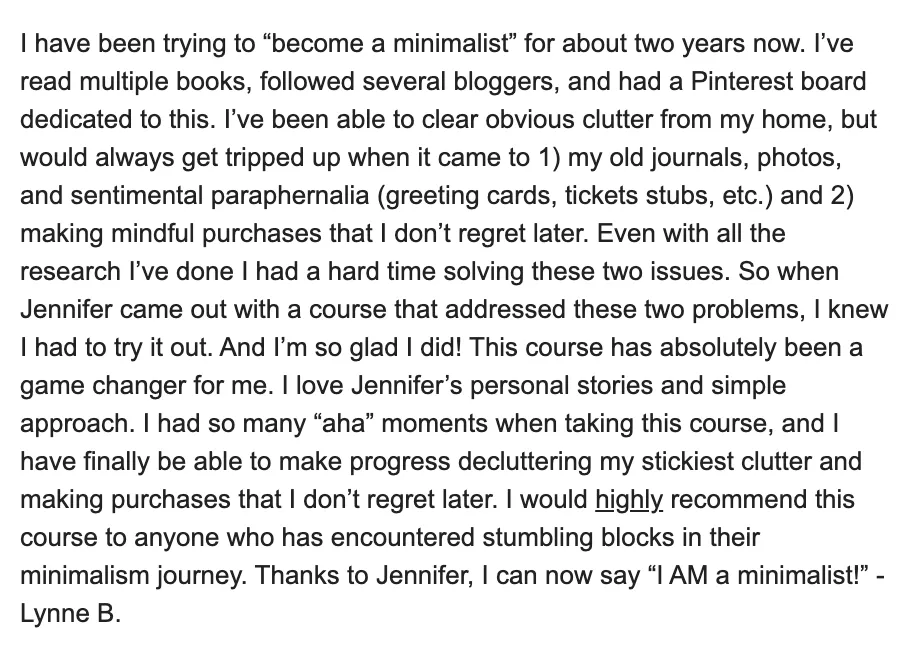 "This course has absolutely been a game-changer for me. I love Jennifer’s personal stories and simple approach. I had so many “aha” moments when taking this course, and I have finally been able to make progress decluttering my stickiest clutter and making purchases that I don’t regret later."